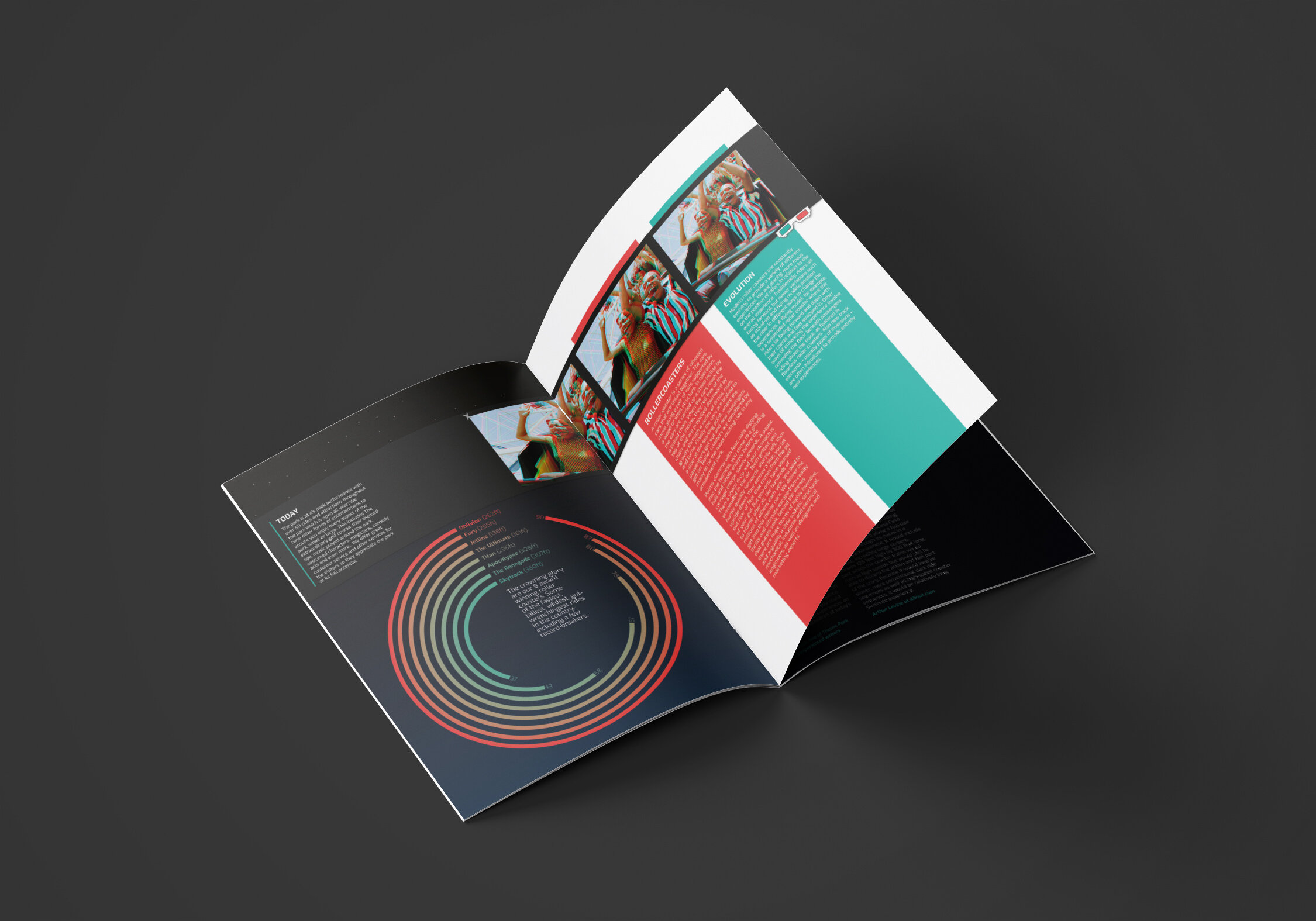 Design project from my time at Shillington Design School. All photos were converted into anaglyph images that can be viewed as 3D using traditional red/green 3D glasses. Red and green were used as highlight colours against a predominently black and dark grey colour scheme.